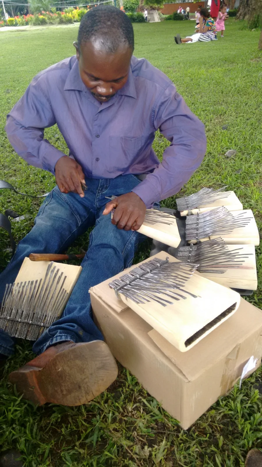 James Kamwaza tuning hera mbira in the park before shipping them.